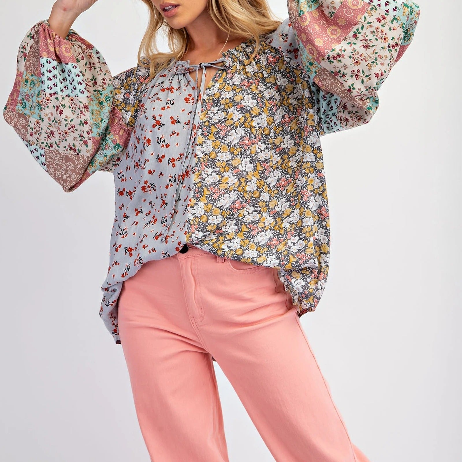 This patchwork blouse is crafted from airy, lightweight fabric with a billowy silhouette that moves with ease. The gathered neckline and voluminous sleeves add a soft, romantic touch, while the mixed floral prints bring a vintage-inspired charm.